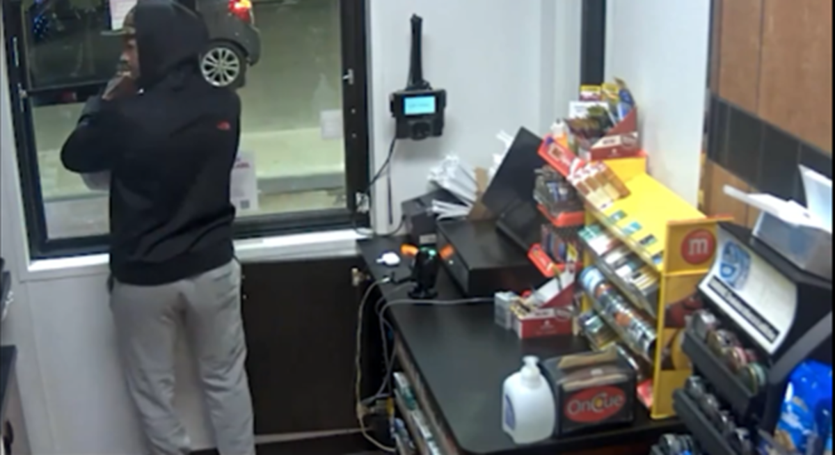 A robbery suspect robbed an OnCue near Southwest 119th Street in Oklahoma City around 3 a.m. on Feb. 7 but unfortunately was captured on camera as he showed movements as one totally confused and lost trying aimlessly to break free through the window, his counterpart was seen outside the window directing him.