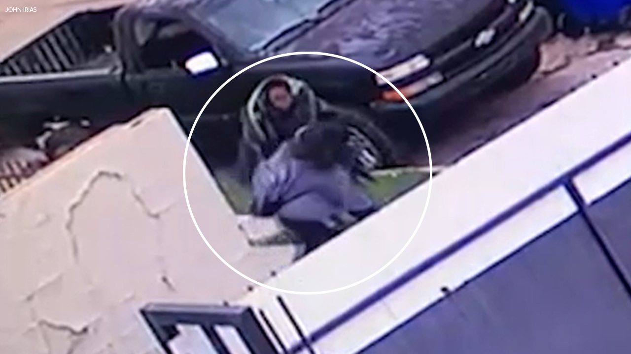 The bystander, John Irias, is seen rushing over to help. He pulls the attacker off the girl and pins the woman down until authorities get there.