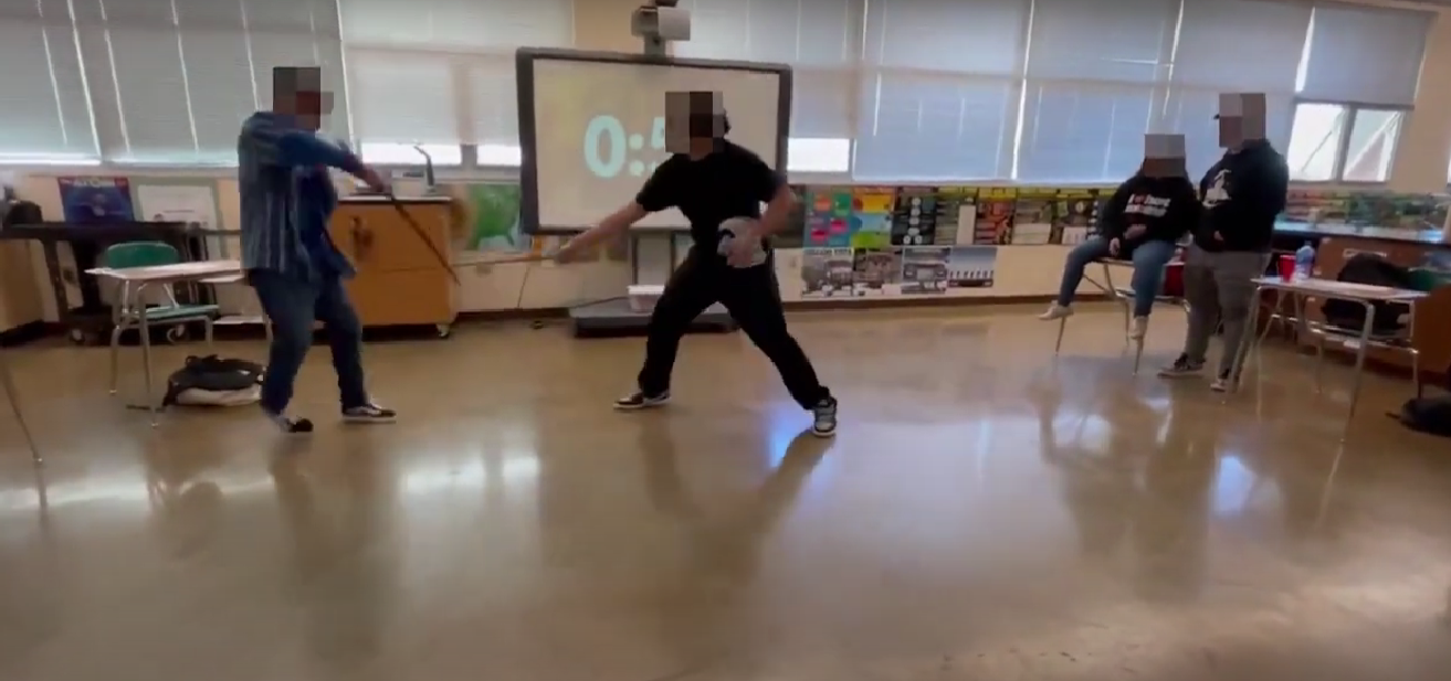 According to the lawsuit, the teacher surprised the students by revealing two swords, set a timer, cleared the desks, and directed them to take turns fighting each other.