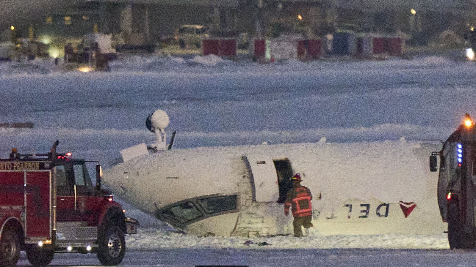 Dramatic images on local broadcasts and shared on social media showed people stumbling away from the upside down CRJ-900 plane, shielding their faces from strong gusts of wind and blowing snow.
